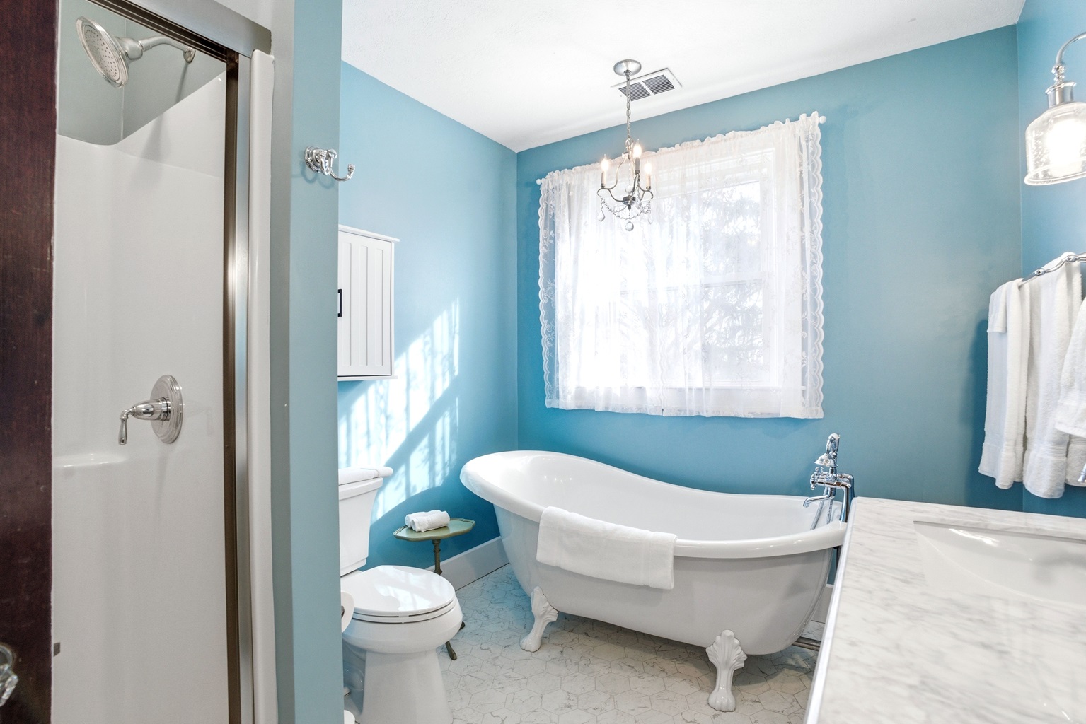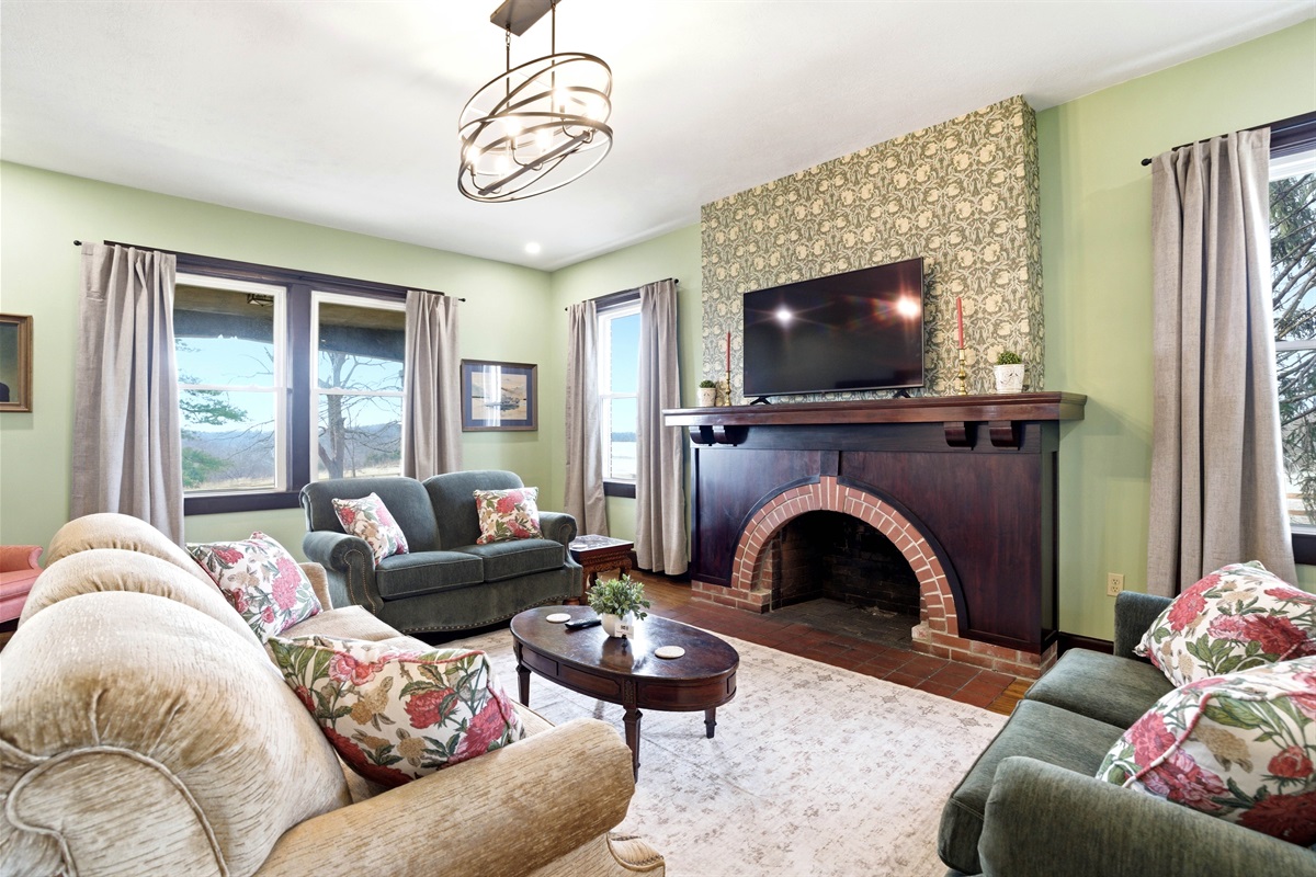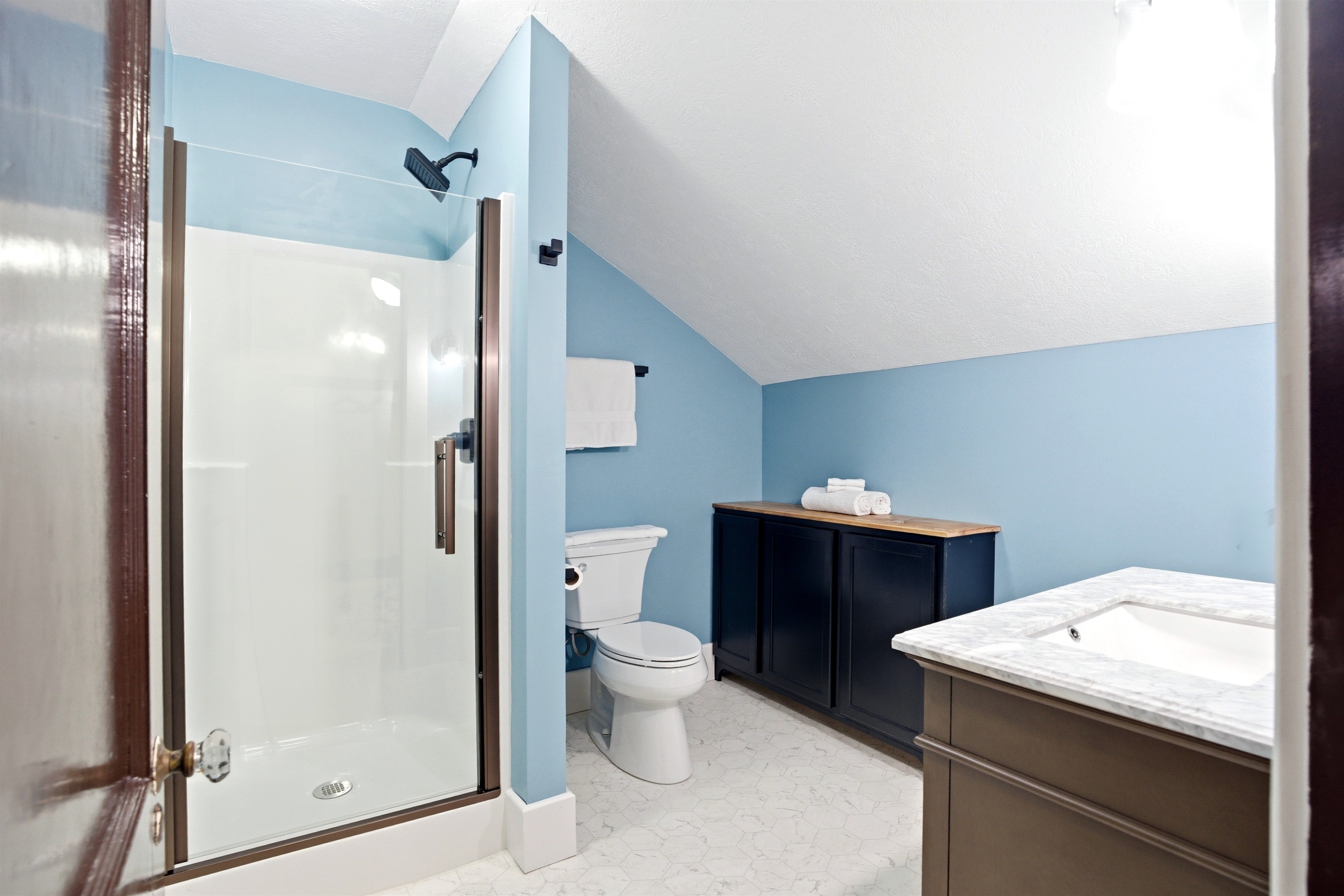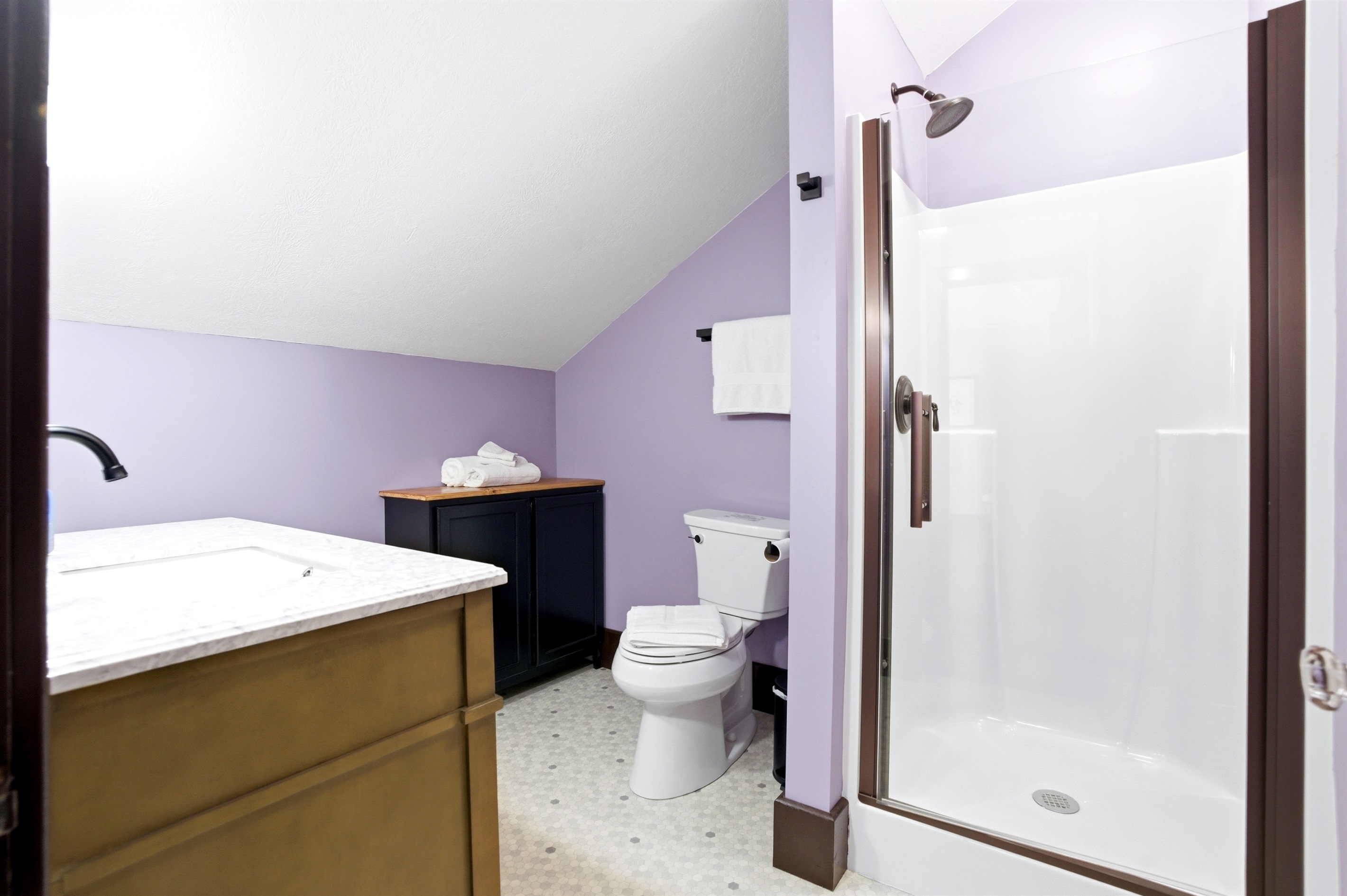 Inside, the home blends historic charm with all the modern conveniences guests expect, including comfortable sleeping spaces, climate control, Wi-Fi, a fully equipped kitchen, and a tankless water heater for endless hot showers. You get the feel of a quiet country home without sacrificing comfort.