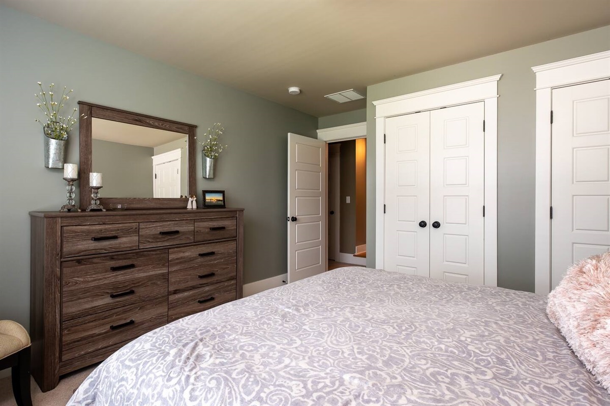 First-floor primary suite with a comfortable bed and easy access to the laundry area