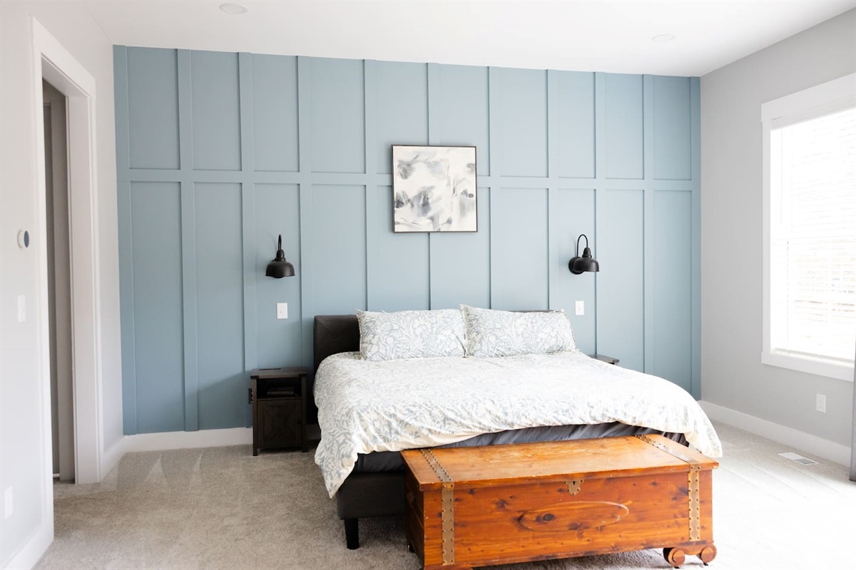 Large bedroom with private sink and shared access to private shower/toilet rooms with bedroom #2. Quaint under stair nook on opposite wall.
